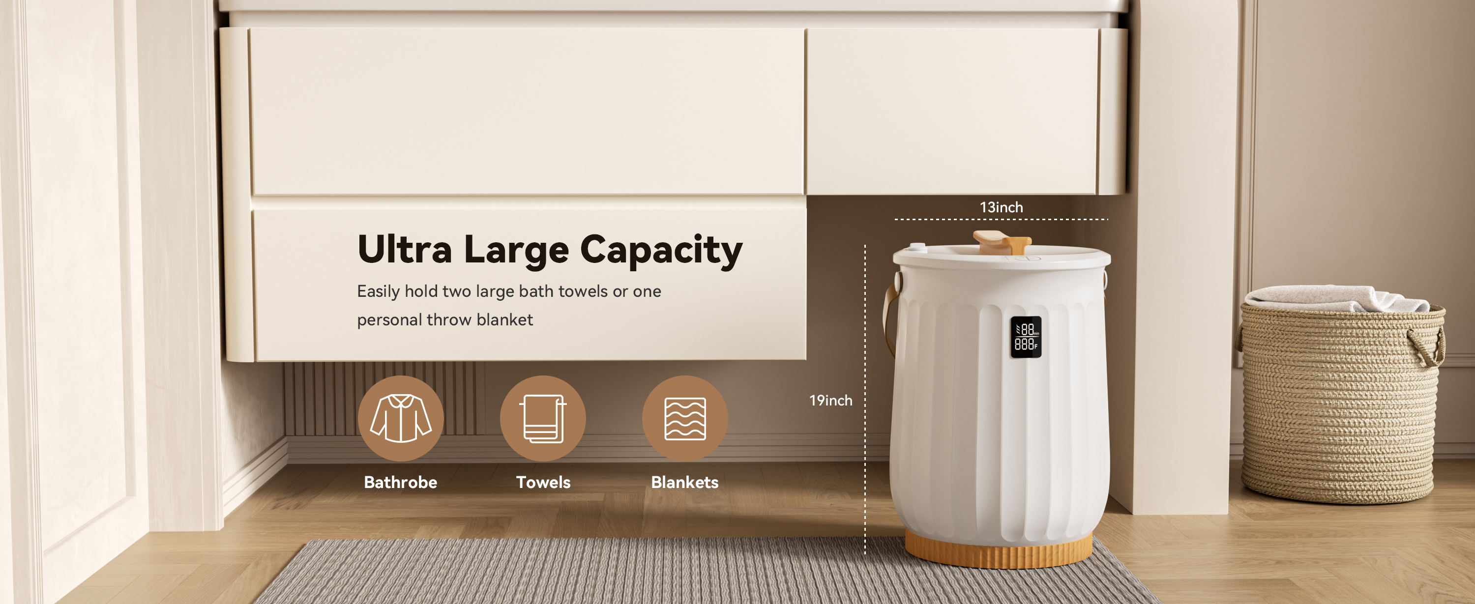 20L Large Capacity: accommodate two 40x 70" towels, bathrobes, pjs, socks and more. Note: cannot used to heat uo wet items.